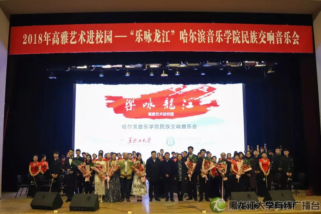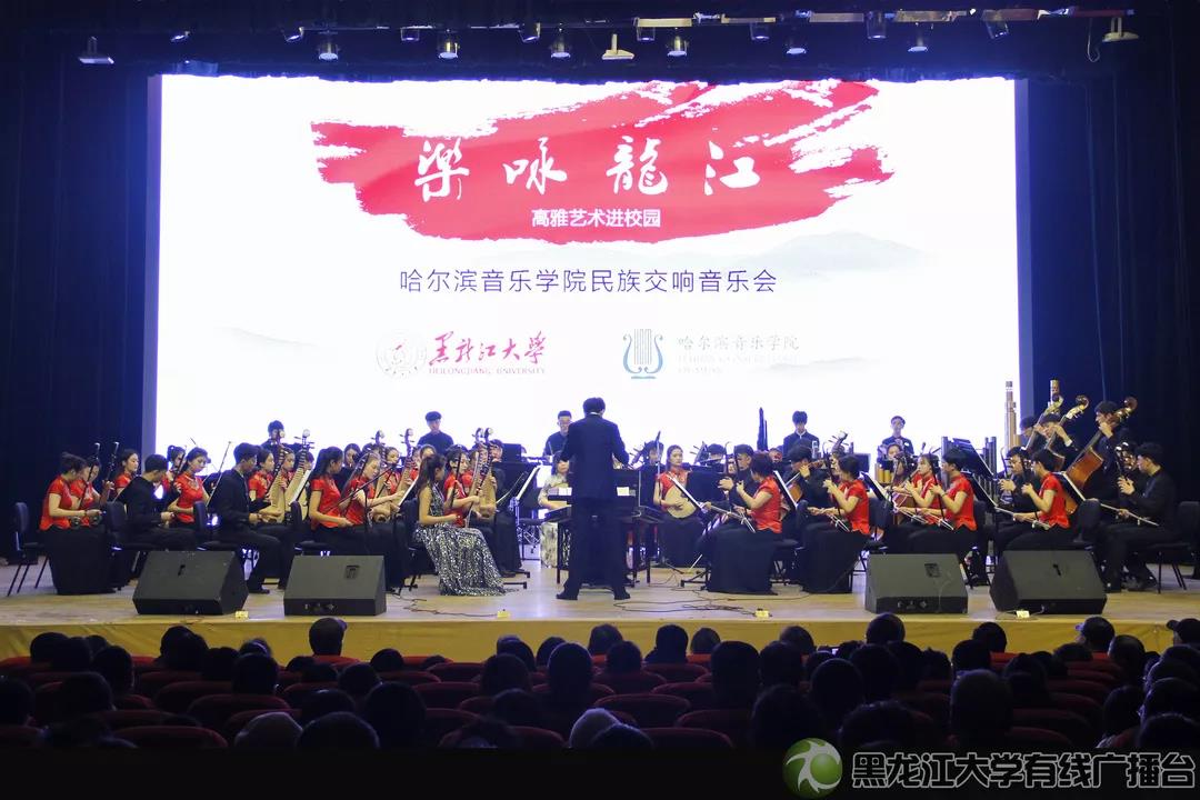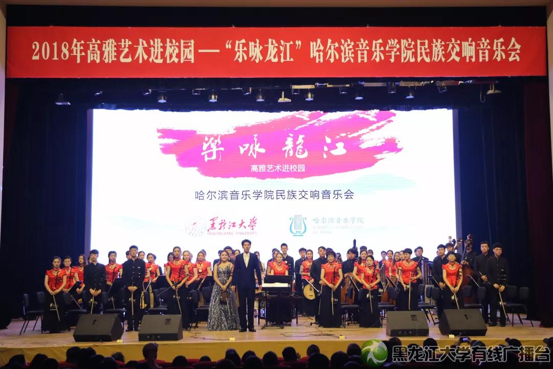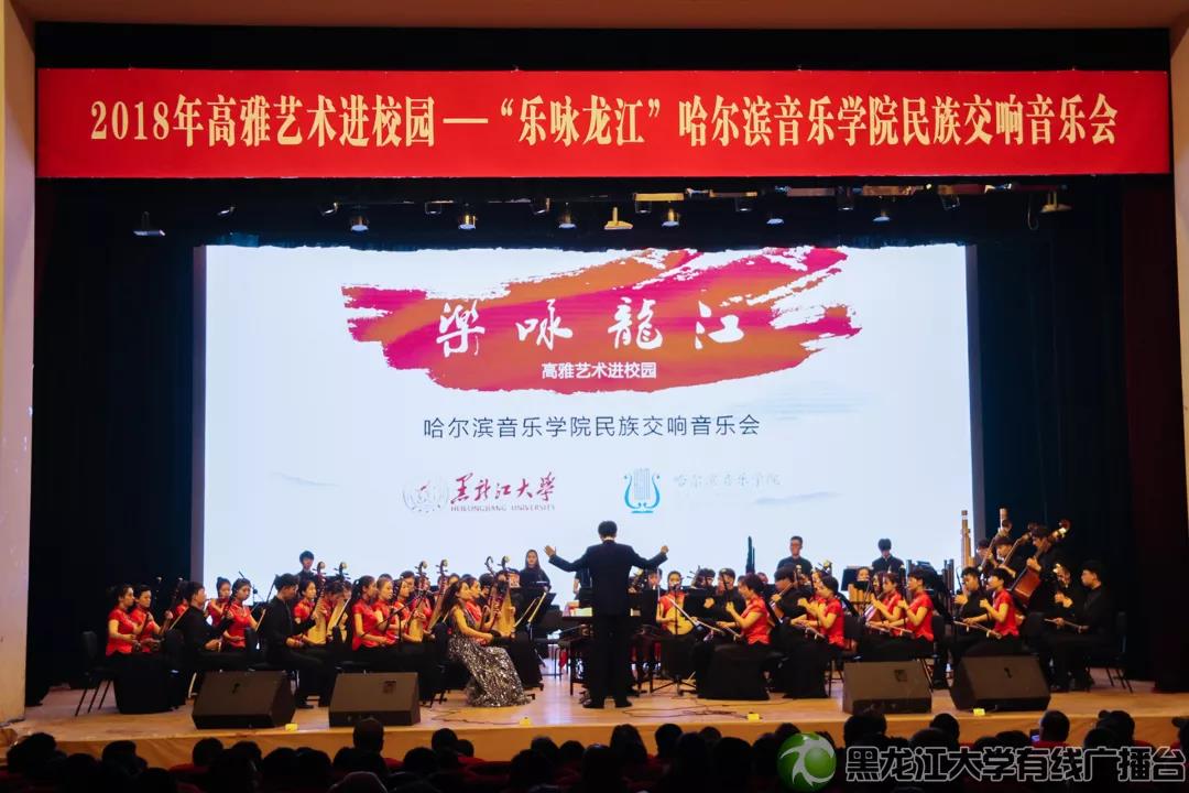 11月14日晚6时,2018高雅艺术进校园系列活动——“乐咏龙江”哈尔滨音乐学院民族交响乐音乐会在我校音乐厅举行。本次活动由省教育厅、省财政厅、省文化和旅游厅共同主办,我校团委承办。校党委书记王永清,哈尔滨音乐学院党委书记关健,校党委副书记蒋晶洁、丁宏,省财政厅科教处副处长李双菊,省教育厅体卫艺处副调研员李向东等嘉宾与现场近千名师生共同观看了精彩的音乐会。