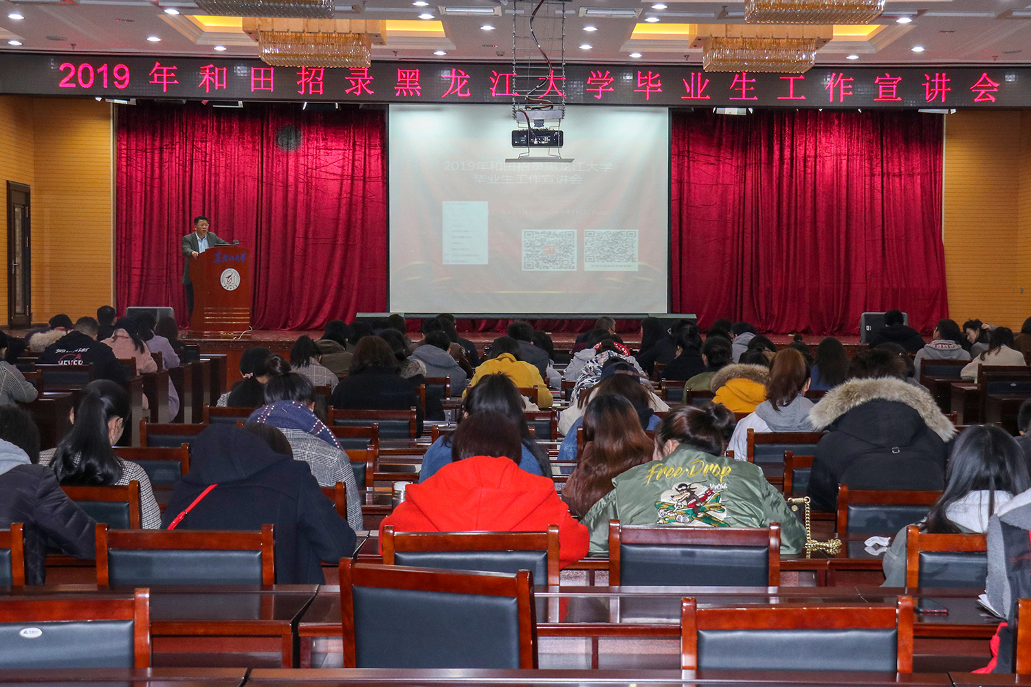 会上,丁宏副书记代表学校对和田地区专项招录组到我校进行专场招录表示欢迎。她从学校的历史沿革、学科概况、办学特色等方面介绍了学校基本情况。她指出,黑龙江大学始终将“志存高远,爱国奉献,艰苦奋斗,自强不息”的精神作为学校人才培养的主线,并始终将“服务国家和地方经济发展,引导和鼓励毕业生到基层工作,到祖国最需要的地方建功立业”作为就业工作的总基调。她希望党员同学们能够积极响应党中央的号召,到祖国最需要的地方去砥砺奋斗、锻炼成长、建功立业,希望大家能够抓住这次就业机会到新疆去工作,在实践中增长自己的才干,在奋斗中实现自己的人生价值。