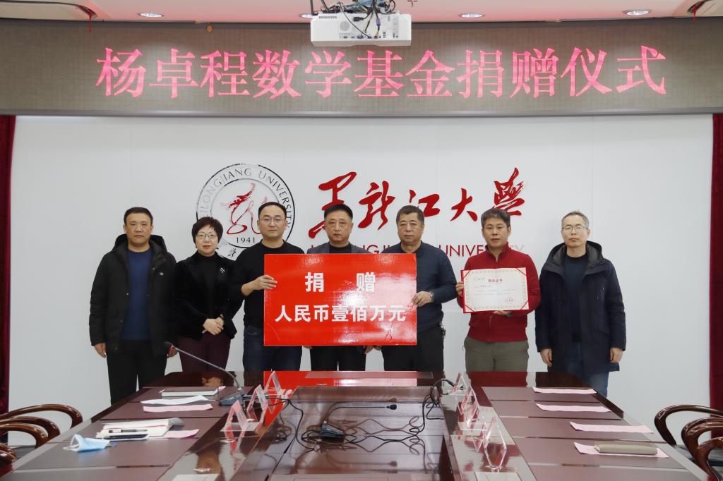 仪式上,杨佳文女士代表杨卓程校友向母校捐赠100万元人民币,杨占波校友、钮薇娜女士、杨佳文女士发表讲话,他们深情地回忆了杨卓程校友的成长经历,对杨卓程校友的数学天赋表示肯定与赞赏,也纷纷表达了对学校和数学系的感激与祝愿之情。杨卓程校友于1977年以优异的成绩考入黑龙江大学数学系,并遇到了影响自己一生的老师和同学,在校期间他成绩优异,学术上颇有建树,耐心帮助同学,毕业后母校为其提供了宝贵的进修和留学机会,对于他在学术方面的成长影响深远。