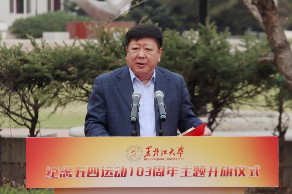 校党委书记王永清在仪式上讲话。他充分肯定了过去的一年里,我校广大青年师生在各领域所取得的突出佳绩,特别是在学校疫情防控工作中,广大师生严格遵守学校防疫规定,主动配合各项工作,认真完成线上学习任务,积极投身志愿服务,讲大局、肯奉献,充分发挥了广大青年师生在校园疫情防控中的积极作用,用实际行动彰显了新时代黑大青年乐观向上、勇于担当的青春风采。王永清书记希望广大青年要牢记习近平总书记的殷切嘱托,立志民族复兴,不负韶华,不负时代,不负人民,在青春的赛道上奋力奔跑,争取跑出当代青年的最好成绩。