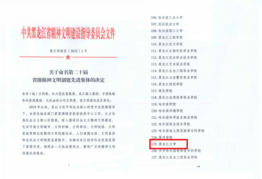 日前,中共黑龙江省精神文明建设指导委员会发布《关于命名第二十届省级精神文明创建先进集体的决定》,我校入选第二十届省级精神文明创建先进集体名单,被命名为“省级文明校园标兵”。