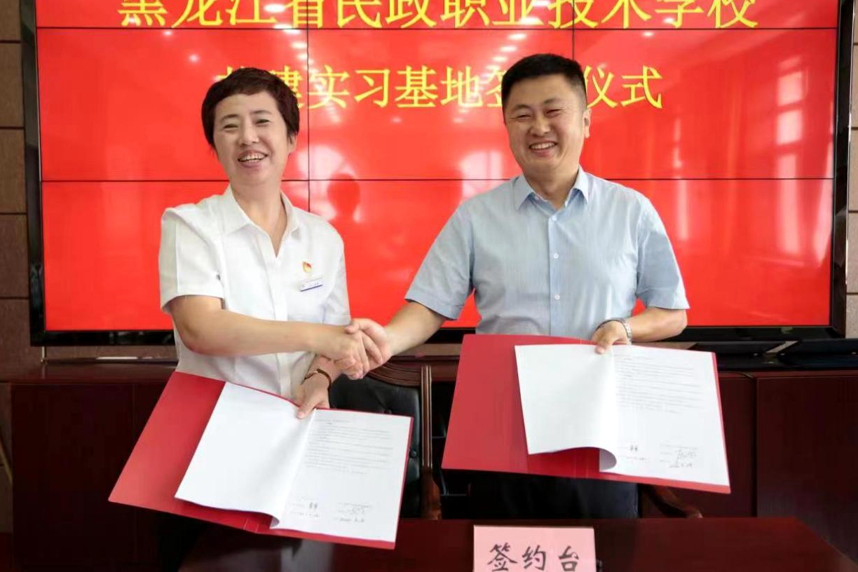 6月28日上午,我校与黑龙江省民政职业技术学校共建校外实习基地协议签订暨揭牌仪式在黑龙江省民政职业技术学校举行。省民政厅党组成员、副厅长孙镝飞,校党委常委、副校长李卓,黑龙江省民政职业技术学校党委书记、校长马荣,省民政厅二级巡视员兼人事处处长高广庆、慈善社工处处长翟福利,黑龙江省民政职业技术学校专职副书记王军及相关科室负责同志,我校教务处、政府管理学院相关负责同志出席仪式。黑龙江省民政职业技术学校副校长樊晓红主持签约仪式。