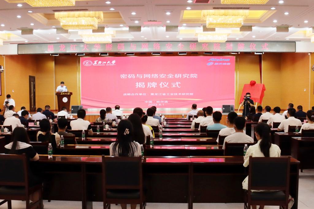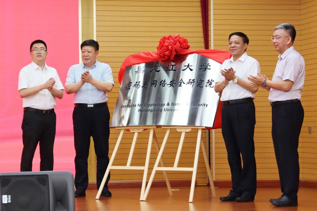 仪式上,黑龙江大学党委书记王永清、黑龙江省国家密码管理局局长黎广波、黑龙江省工业技术研究院院长付强、航天信息股份有限公司加密经济事业部总经理王申共同为“黑龙江大学密码与网络安全研究院”成立揭牌。