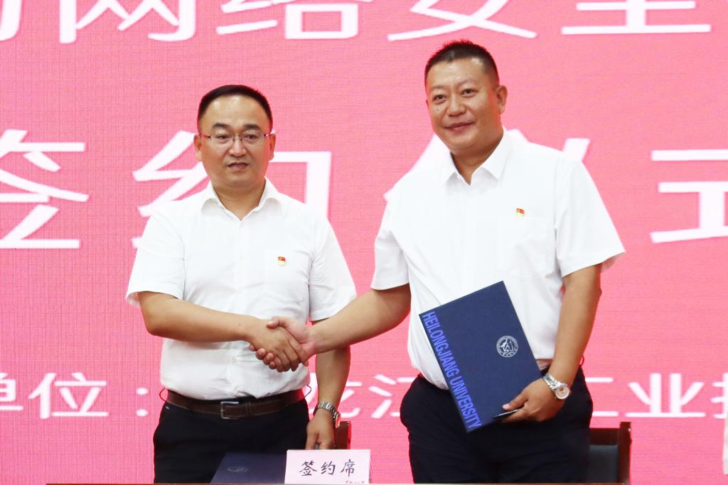 黑龙江大学密码与网络安全研究院院长唐孝敏与黑龙江航天信息有限公司总经理任海鹏签署共建协议。
