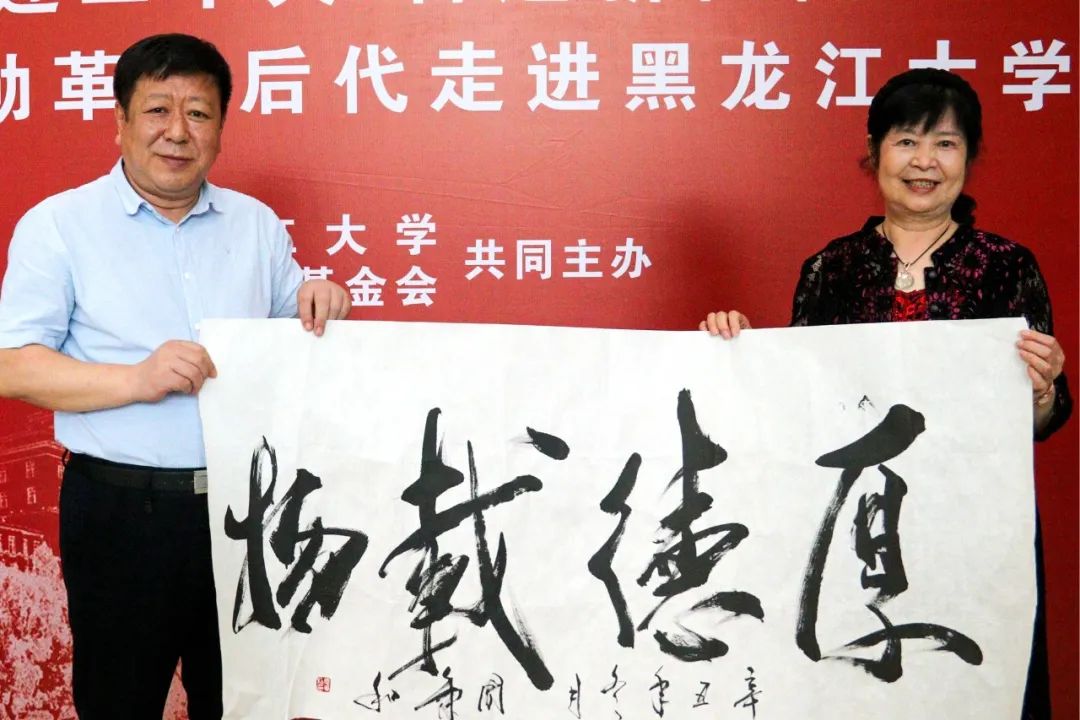 王永清书记代表学校向东北抗联、东北野战军后代,景华公益基金会会长张景华女士赠送“八秩弦歌”黑龙江大学80周年校庆历史长卷。