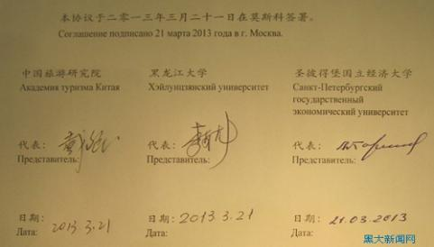 2013年3月,时任国务院副总理汪洋(后排右一)、俄罗斯联邦副总理戈洛杰茨(后排左一)共同见证中俄全面战略协作协同创新中心牵头单位黑龙江大学、中国旅游研究院与圣彼得堡国立经济大学签署关于旅游科研、教育与国际交流的三方合作协议。