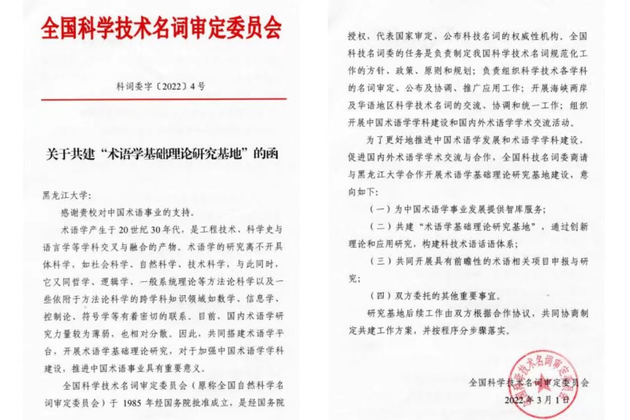 2022年3月,学校申获“术语学基础理论研究基地”(全国科学技术名词审定委员会与黑龙江大学共建)。