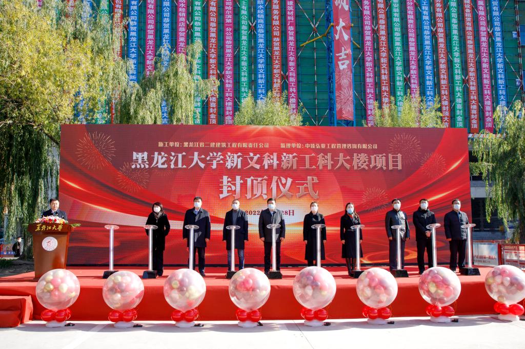 10月28日上午,黑龙江大学新文科新工科大楼项目封顶仪式在禹志园举行。校党委书记王永清,党委副书记丁宏,副校长严明、张颖春、于文秀、钟卫东、井立强、李卓,施工单位黑龙江省二建建筑工程有限责任有限公司党委书记、董事长包丽丽,监理单位中臻弘业工程管理咨询有限公司常务副总经理王超,学校相关职能部门负责人,施工单位和监理单位代表参加仪式。仪式由副校长李卓主持。