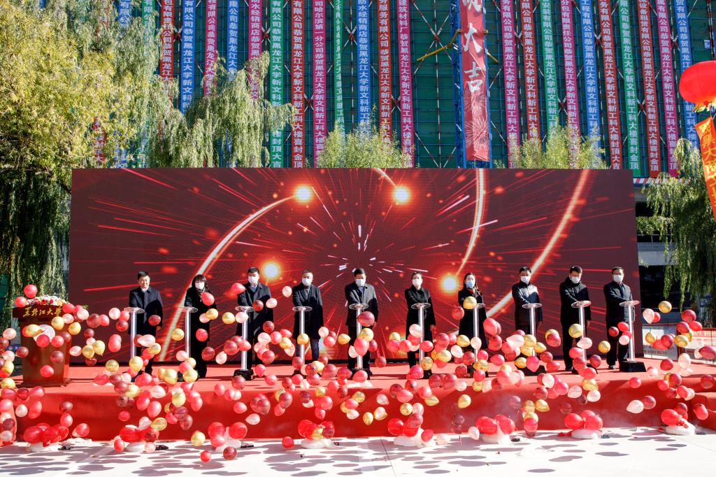全体领导共同启动黑龙江大学新文科新工科大楼项目封顶仪式柱。