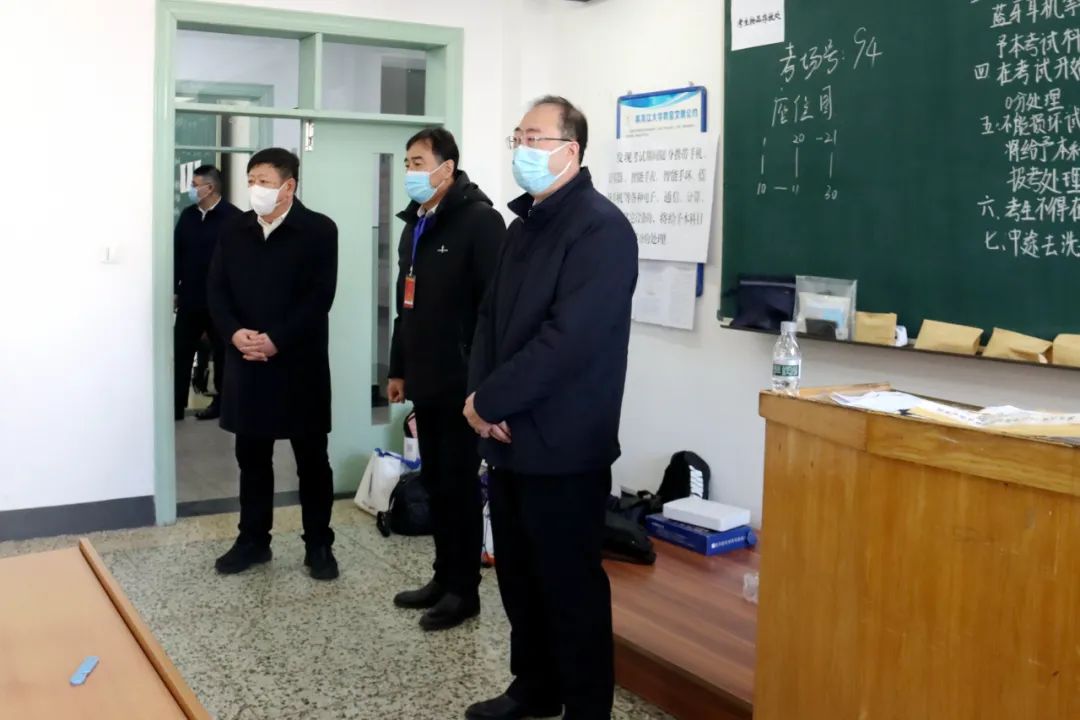 于志伟一行深入视频监控室、考场和备考室等处,实地了解监考工作,通过监控设备和巡视查看现场考生考试情况。详细询问了考务工作人员考点布置、考场环境及考生入场等方面的工作情况,对我校组织的考务工作给予了充分肯定。