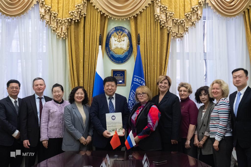 代表团一行访问莫斯科国立语言大学,与该校校长克拉耶娃、主管项目和青年政策问题副校长古谢依诺娃、主管对外合作问题副校长斯托罗热夫、外事处、国际教育项目学院、翻译学院相关负责人举行工作会谈。双方高度评价两校近年来合作,围绕加速推进中俄语言教育大学联盟建设展开深入交流。王永清介绍了我校对俄办学优势,表示成立中俄语言教育大学联盟是落实中俄两国元首《联合声明》中关于支持中俄同类大学联盟建设,深化语言教学合作的重要实践。作为中方发起单位,我校在语言教学人员规模和教学水平上具有较大优势,目前从事俄语教学和对俄科研的教职工达300余人。2006年,学校与远东联邦大学共建了俄罗斯第一所正式运行的孔子学院,充分展示了我校在国际中文教育领域的影响力。希望双方以联盟成立为契机,推动两校务实合作,为中俄人文合作与交流作出更大贡献。克拉耶娃表示,莫斯科国立语言大学拥有悠久的办学历史,语言教育领域在全俄享有盛誉,相信未来两校在联盟框架下合作前景广阔,希望双方依托现有合作基础,就联盟建设事宜保持密切沟通。随后,克拉耶娃校长转交了两校于2023年12月签署的《关于发起成立中俄语言教育大学联盟的合作协议》。
