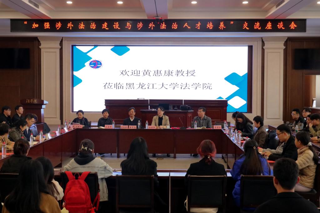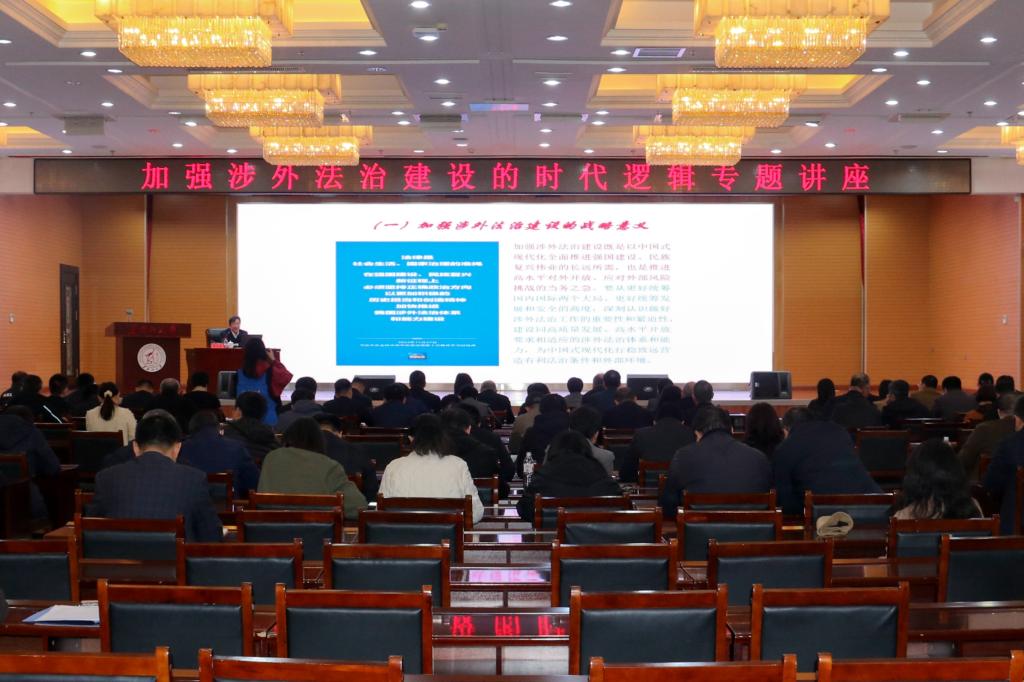 为深入贯彻落实习近平总书记关于加强涉外法治建设重要论述精神,更加深刻、准确地领会新形势下加强涉外法治建设时代逻辑的重要意义,4月9日上午,我校在主楼一楼报告厅举行《加强涉外法治建设的时代逻辑》专题讲座暨校党委理论学习中心组扩大会议。我校哲学系82届校友黄惠康教授受邀回到母校担任主讲。全体校领导、全体中层干部及法学院相关教师参加。校长王敬波主持活动。
