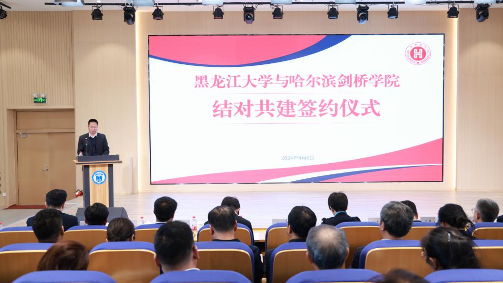 4月8日上午,我校与哈尔滨剑桥学院结对共建签约仪式在哈尔滨剑桥学院举行,省委教育工委副书记王震、省委教育工委组织部部长赵洪斌出席签约仪式。校长王敬波、党委副书记李君明带队参加签约活动,学校办公室、组织部、经济与工商管理学院、电子工程学院、西语学院、机电工程学院、教育科学研究院、艺术学院、建筑工程学院等单位主要负责人一同参加。签约仪式由哈尔滨剑桥学院副校长张颖春主持。