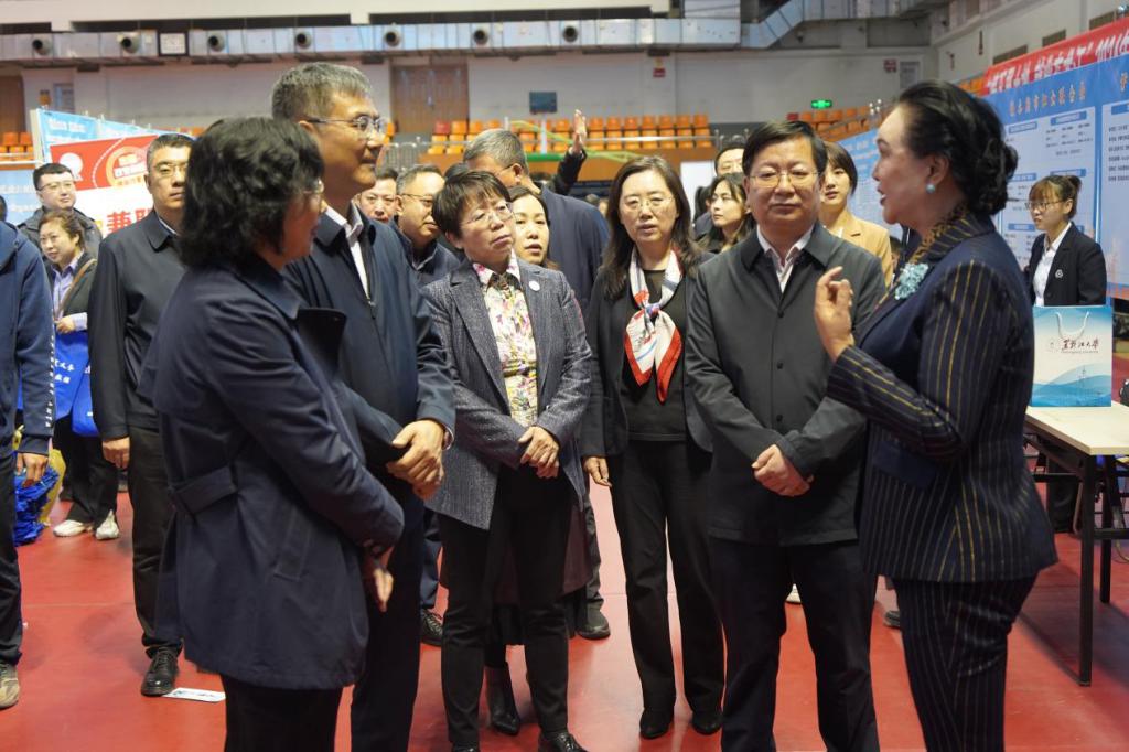 4月18日上午,“情系黑土地·就业在龙江”女大学生专场招聘会在我校体育馆举行,本次活动由黑龙江省妇女联合会、省教育厅、省人社厅主办,黑龙江大学承办。省教育厅副厅长雒文虎、省人社厅副厅长于占淮、省妇联副主席柏英出席招聘活动,我校校长王敬波、党委副书记丁宏陪同巡场招聘会。此次招聘在引领、凝聚、服务女性人才上持续发力,促进我省女大学生充分就业,助力我省企业留住人才、用好人才,实现高质量发展。