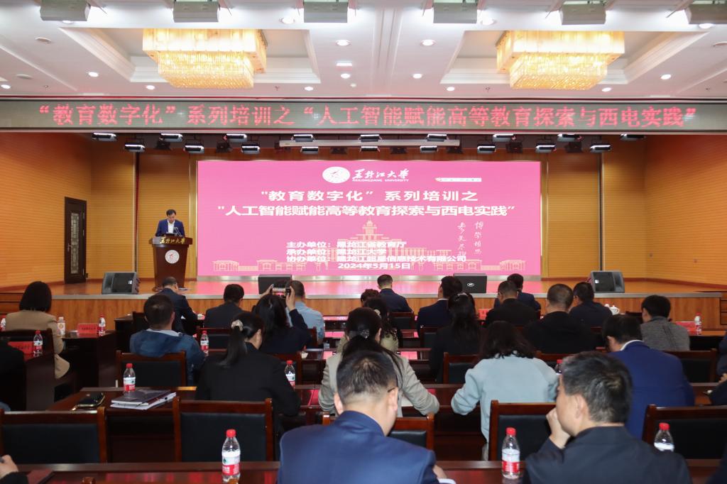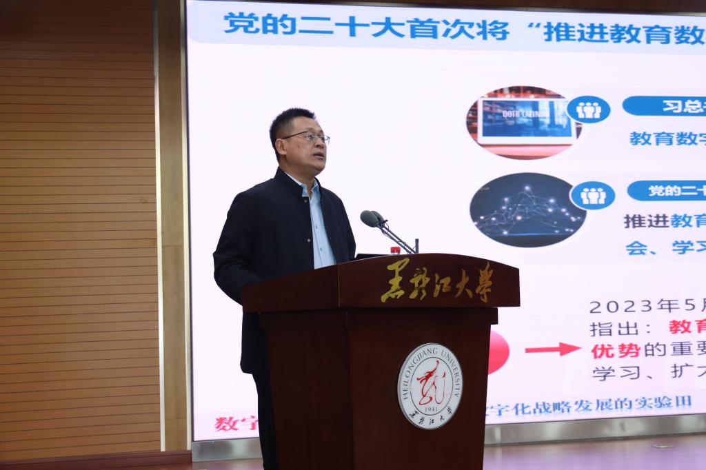 为进一步探索人工智能与教育融合新模式,更好利用人工智能技术赋能教育教学。5月15日下午,黑龙江省教育厅与黑龙江大学邀请西安电子科技大学苗启广教授作“教育数字化”系列培训之“人工智能赋能高等教育探索与西电实践”专题讲座。讲座以线上和线下结合的方式举行,黑龙江大学官方微信视频号对讲座进行线上同步直播。省教育厅高等教育处相关人员、哈市内28所高校教务处及本科生院负责人、我校全体校领导、全校中层干部现场参会,省内高校6300余人通过线上参会。讲座由黑龙江大学教务处处长吴华洋主持。