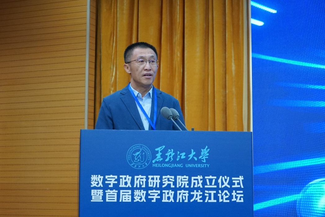 6月23日,黑龙江大学数字政府研究院成立仪式暨首届数字政府龙江论坛在主楼一楼报告厅举行。国家信息中心信息化和产业发展部主任单志广,黑龙江省工业和信息化厅一级巡视员官英敏,校党委书记迟宝旭,校长王敬波,黑龙江省科学技术厅二级巡视员王喜林,黑龙江省营商环境建设监督局党组成员、省政务大数据中心主任张海军,黑龙江省机关事务管理局副局长王威武,黑龙江省数据局副局长王秀锋,绥化市委常委、市人民政府副市长陈国彬,清华大学计算社会科学与国家治理实验室执行主任、黑龙江大学数字政府研究院学术委员会主任孟庆国,黑龙江大学数字政府研究院名誉院长何颖,上海报业集团财联社副总编辑王全宝以及来自国内知名高校的专家学者,省内期刊代表,学校相关职能部门主要负责同志和政府管理学院师生200余人参加成立仪式。黑龙江大学政府管理学院院长、数字政府研究院院长袁洪英主持成立仪式。