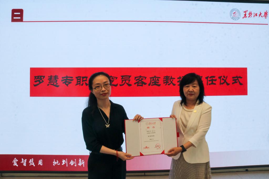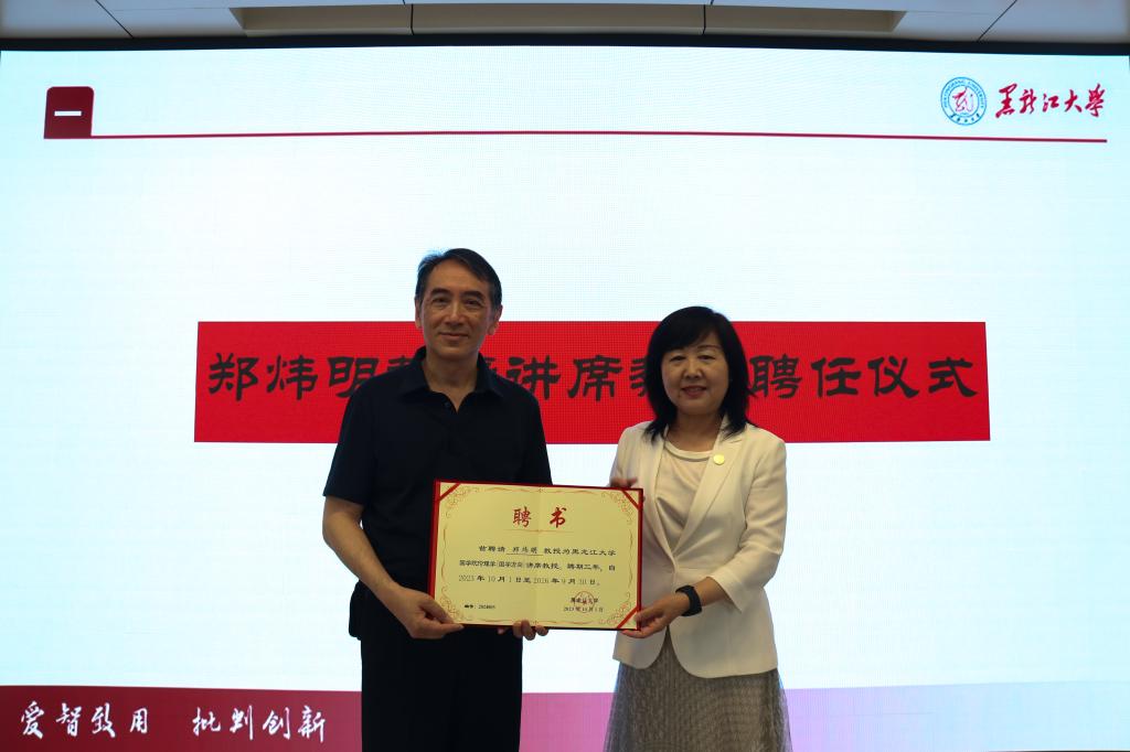 于文秀副校长向郑炜明教授颁发讲席教授聘书和“黑龙江大学国学发展研究基金”捐赠证书、向罗慧专职研究员颁发客座教授聘书;