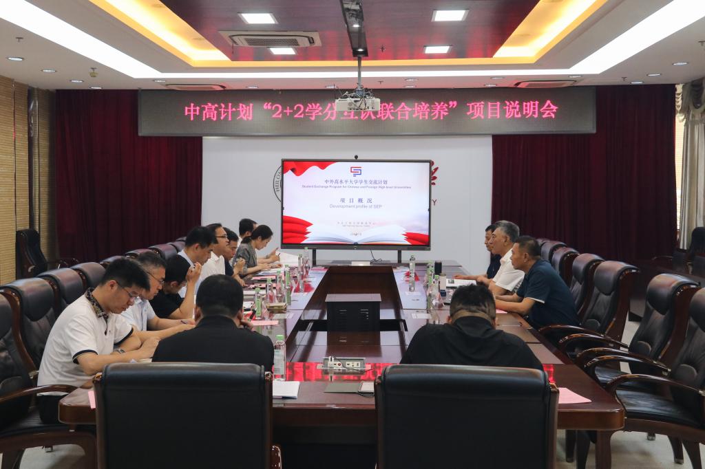 7月15日下午,教育部中外人文交流中心中高计划项目顾问孙海明,中高计划全国服务中心主任胡伟、副主任付超鹏来校调研,双方在主楼A802会议室召开中高计划“2+2学分互认联合培养”项目说明会。副校长井立强,以及教务处、重点建设与发展工作处、招生就业指导中心、国际合作与交流处、经济与工商管理学院、艺术学院、生命科学学院、计算机科学技术学院(软件学院)、化学化工与材料学院等相关单位负责人参加会议。会议由国际合作与交流处处长兼国际文化教育学院院长孙秋花主持。