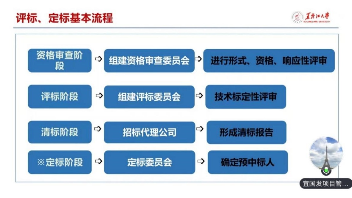 会上,招标代理机构宜国发项目管理有限公司对学生宿舍建设项目公开招标-定标工作开展了专题培训,培训内容涵盖了评标、清标、定标基本流程、评审标准、评审方法、常见问题及解决方案等方面,通过深入浅出的讲解和丰富的案例分享,与会人员对公开招标-评定分离的招标方式有了更为全面的认识和理解。