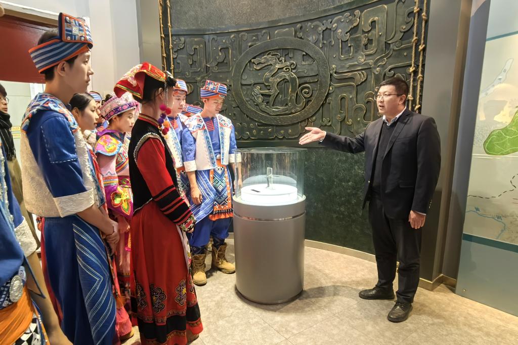 活动结束后,快闪活动组一行来到了黑龙江大学博物馆,展示了来自南宁的非遗作品,并参观了校史馆和馆藏文物展,深入了解学校的发展历程和黑龙江流域少数民族文化。(摄影:孟真 王宏运)
