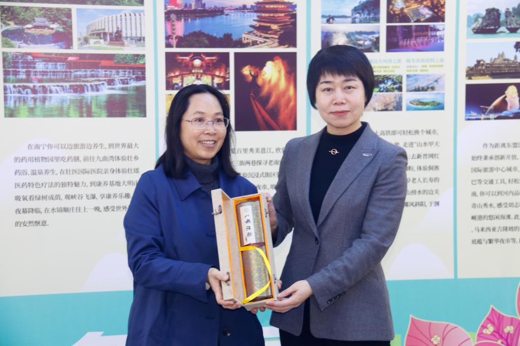 邕抱老铁,互换冬天。12月10日上午,南宁市文化旅游宣传推广快闪活动在我校格致园食堂一楼火热开展。校党委副书记刘凤影,校党委常委、宣传部部长杨其滨,校团委、后勤保障处相关负责同志以及广大师生参加活动。刘凤影代表学校向南宁市文化广电和旅游局赠送《八秩弦歌》长卷。