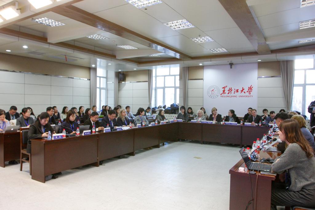 12月11日下午,在黑龙江大学主楼A226召开了中俄语言教育研讨会。此次研讨会围绕商讨联合开展联盟活动、中俄语言教育合作两个议题展开,分别由黑龙江大学国际合作与交流处处长孙秋花,莫斯科国立语言大学国际合作与国际化处长绍基娜和东北师范大学外国语学院副院长高国翠,伊尔库茨克国立理工大学俄语语言教学系主任、预科部主任安东诺娃主持。各高校发言代表围绕对俄合作、对华合作、未来大学联盟工作设想、在华俄文教育、在俄中文教育等内容热烈讨论。