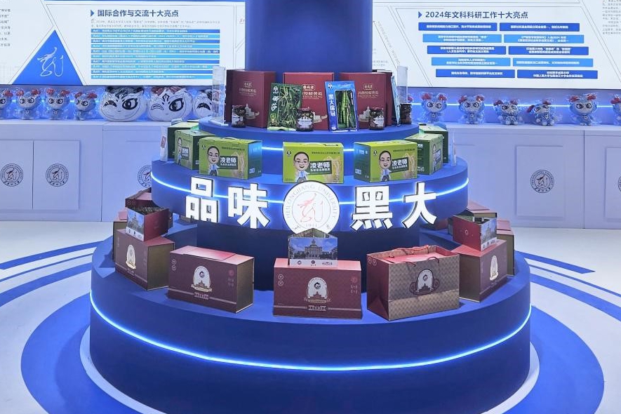 文创黑大:文化赋能点亮创意生活。资产经营公司与艺术学院联合呈现的文创板块,将黑大文化符号转化为可触摸的艺术体验。博古架上陈列着校园系列主题文创,五大连池火山岩与宜兴紫砂混合制成的紫砂系列产品,充满黑大元素的纸雕灯、纸雕本,龙小博、黑大主楼、校徽图案的红甜菜文创冰淇淋,铜镇纸、香薰炉、字母笔等学习用品,毛毡包、帆布包、初心水杯等日常用品,黑大的各种文创产品营造出精致时尚的氛围,每一件展品都承载着黑大的历史记忆与创新精神,让传统文化在现代设计中焕发新生。