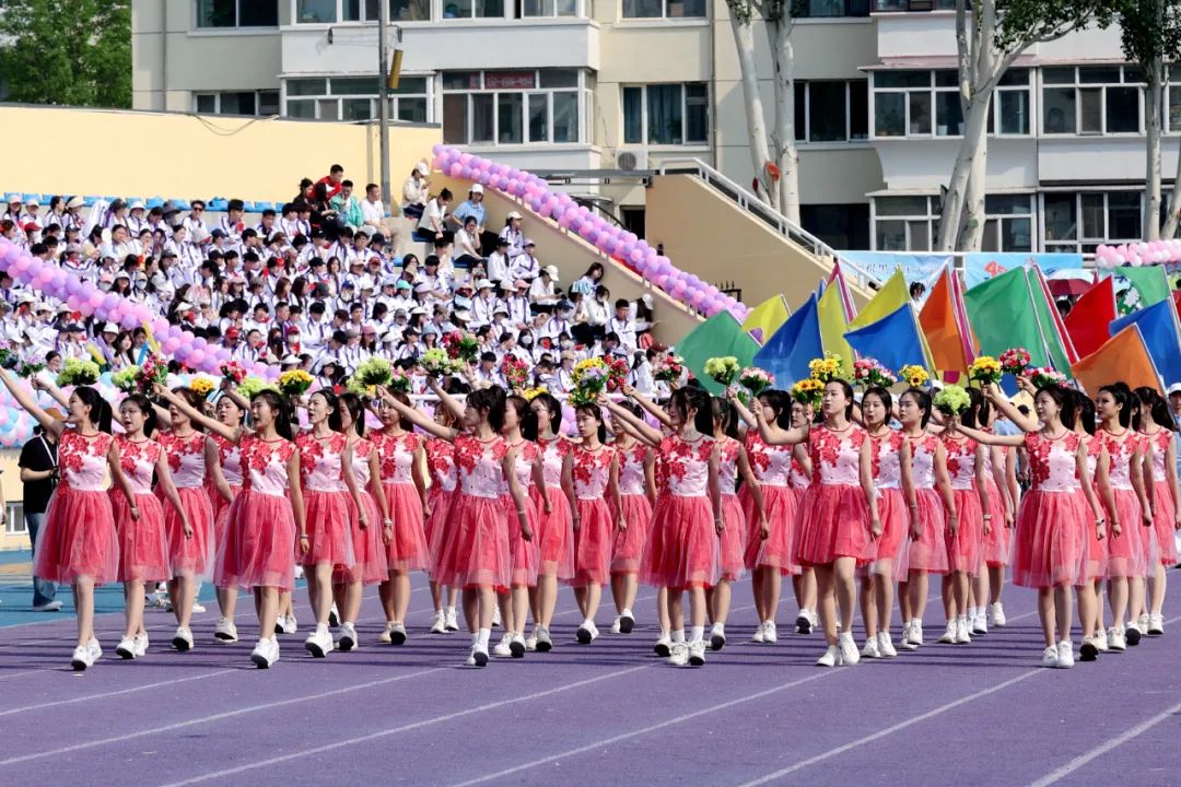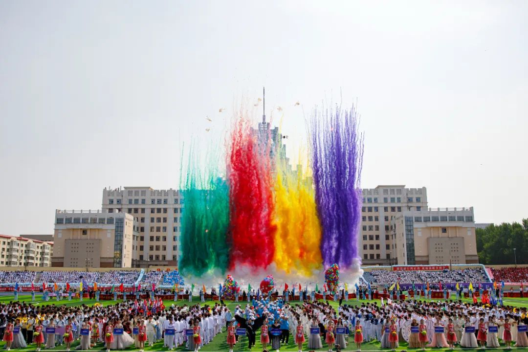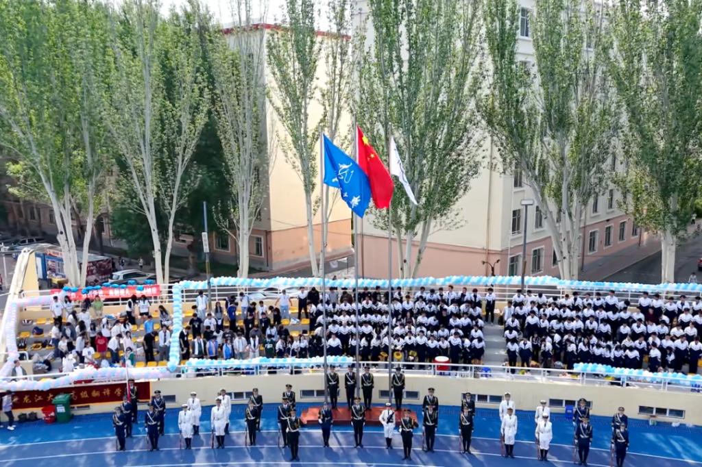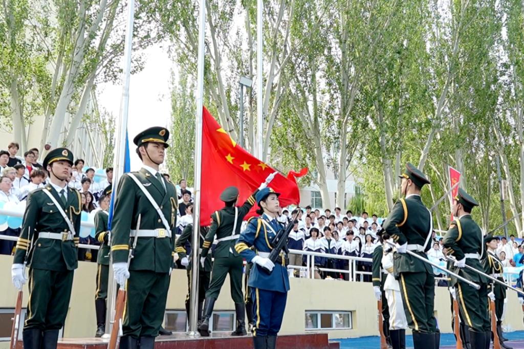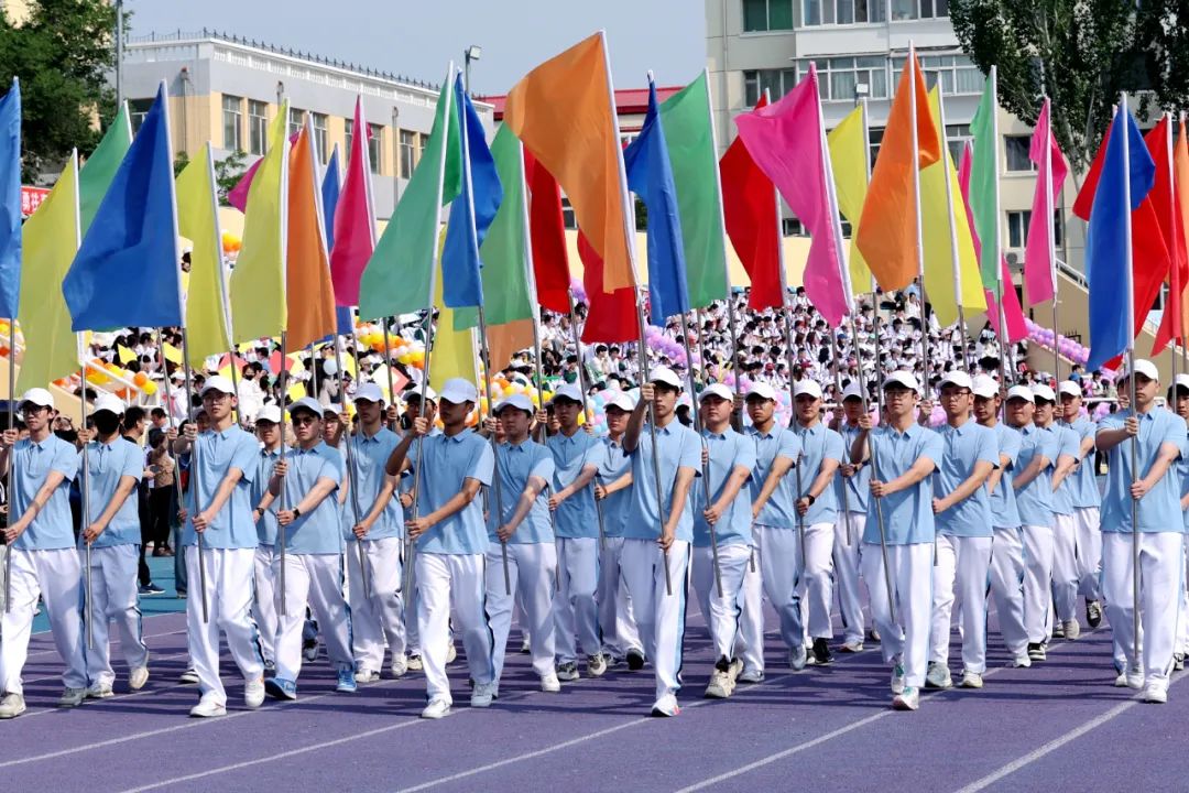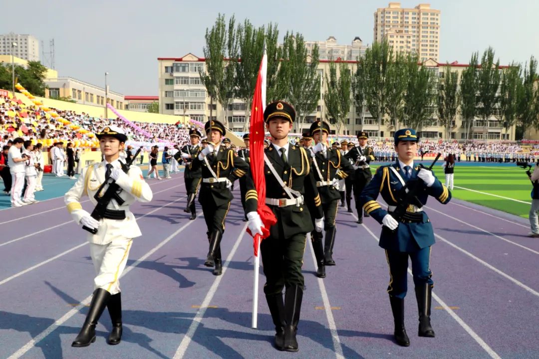 伴随着雄壮的国歌,鲜艳的五星红旗冉冉升起,全场师生肃立。在激昂的校歌声中,校旗、会旗相继升起,三面旗帜在体育场上空迎风飘扬。