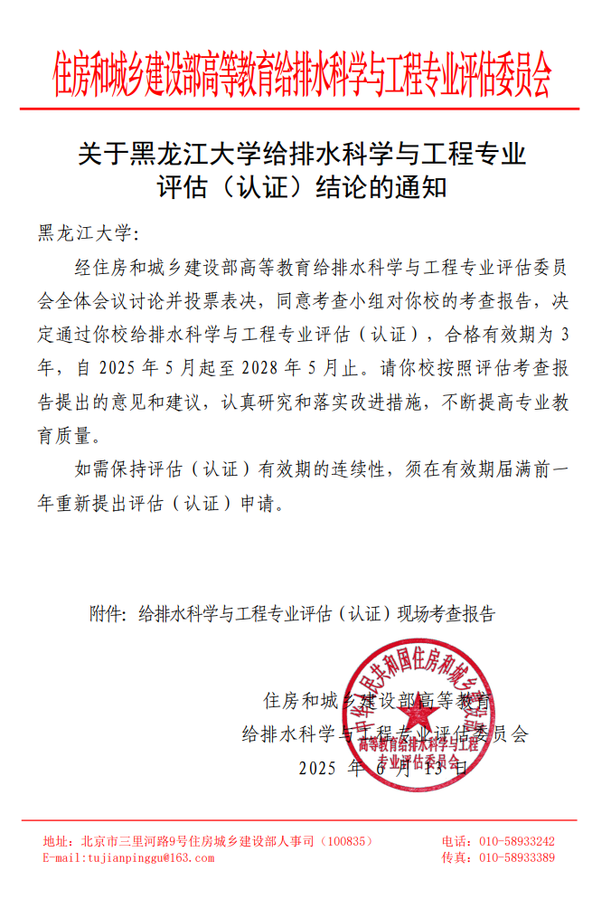 近日,住房和城乡建设部高等教育给排水科学与工程专业评估委员会印发《关于黑龙江大学给排水科学与工程专业评估(认证)结论的通知》,我校给排水科学与工程专业顺利通过首次专业评估(认证),是我校首个通过住房和城乡建设部专业评估(认证)专业。住房和城乡建设部专业评估(认证),包含在工程教育专业认证体系之内,接受住房和城乡建设部、教育部、全国工程教育专业认证机构的业务指导。