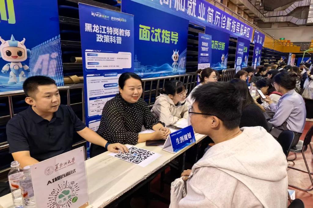 双选会现场设置了“人才政策咨询和就业简历诊断指导服务区”,为毕业生提供一对一政策解读、简历诊断、面试指导、生涯规划等就业指导服务。利用简历智写和模拟面试系统,进一步提升了毕业生的求职效率与匹配精度。