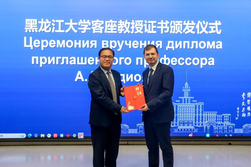 会议期间,井立强向圣彼得堡国立大学教授亚历山大·罗季奥诺夫颁发客座教授证书。随后,俄罗斯作家代表团与黑龙江大学互赠纪念礼物,表达双方对未来合作的美好期待。