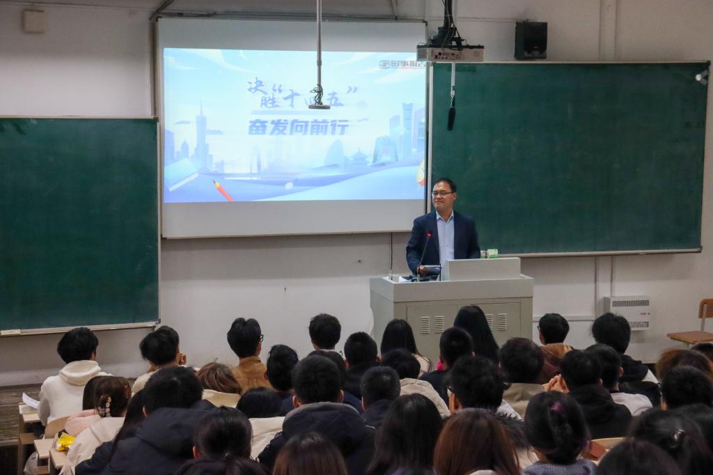 为深入贯彻落实习近平总书记对学校思政课建设的重要指示精神,进一步加强学校思想政治教育,10月27日下午,副校长井立强在2号楼400教室,为2025级数学专业全体学生讲授《决胜“十四五” 奋发向前行》专题思政课。