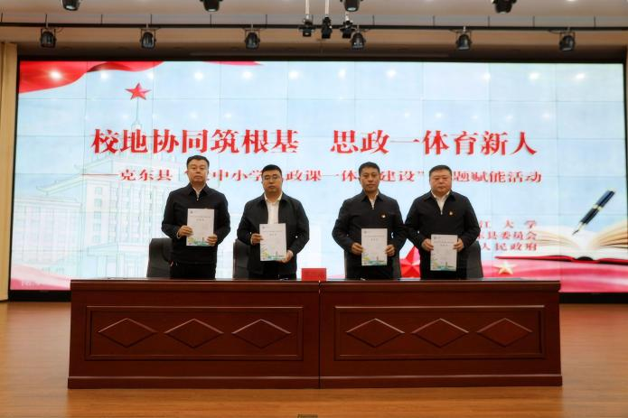 为进一步深化校地合作,充分发挥高校优质教育资源辐射引领作用,赋能县域思政课教师队伍专业化,扎实推进大中小学思政课一体化建设,10月24日,黑龙江大学马克思主义学院应邀赴克东县参加“校地协同筑根基·思政一体育新人”大中小学思政课一体化建设校地合作签约仪式暨培训活动。校长王敬波,文学院、马克思主义学院、学校办公室等部门相关负责同志及克东县领导梁兴旺、许晓飞、张立军、孟祥媛、刘莉霜参加本次活动。‘