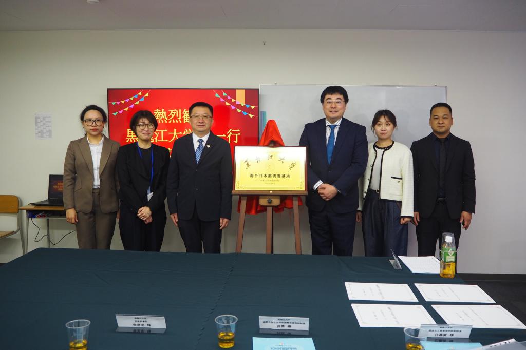 代表团一行访问九州外国语学院东京校区,李君明与九州外国语学院副理事长解友克进行会谈。双方分别介绍两校近期取得的发展成就和办学成绩,围绕推动师资交流、学生海外实习及海外升学等具体问题深入商谈。会后,双方校领导签署《黑龙江大学海外日语专业实习、实践教学基地协议》并为基地揭牌。