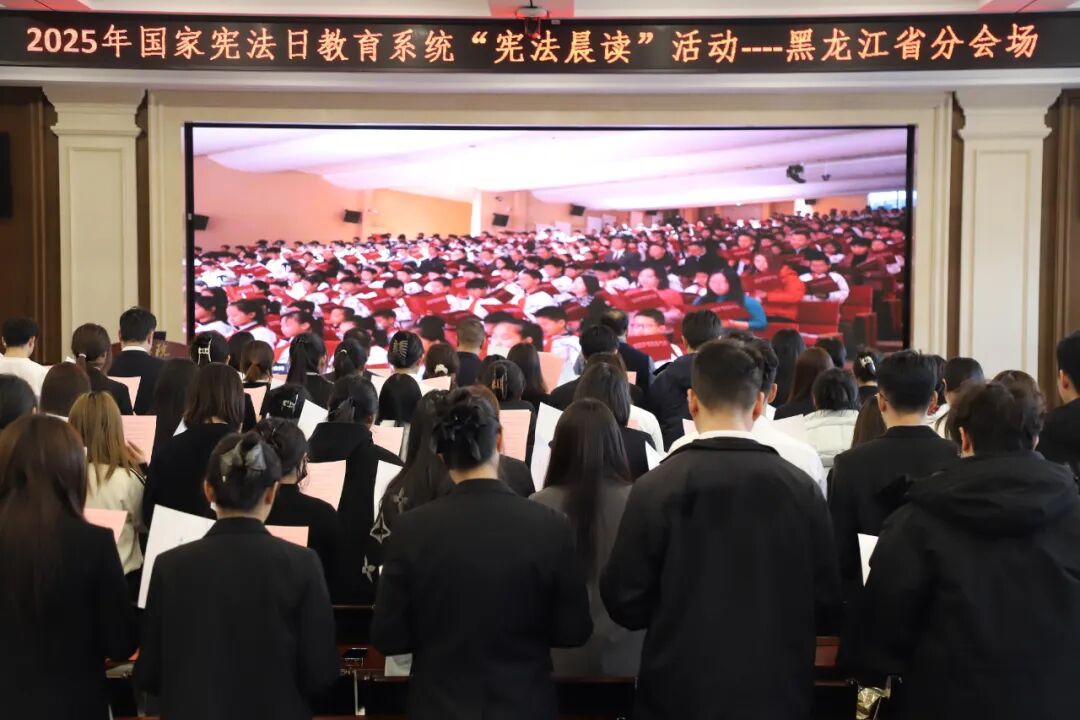 活动中,黑龙江大学法学院院长哈书菊带领全体同学进行宪法晨读,通过宣读宪法核心条款,强化宪法意识和法治观念。法学院优秀毕业生代表和在校生代表联合朗诵《宪法在心,法治同行》,铿锵有力的声音彰显了新时代青年尊崇宪法、维护宪法权威的坚定信念。活动在全体成员合唱《岁月如歌》中落下帷幕。