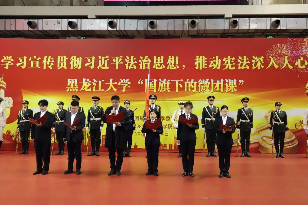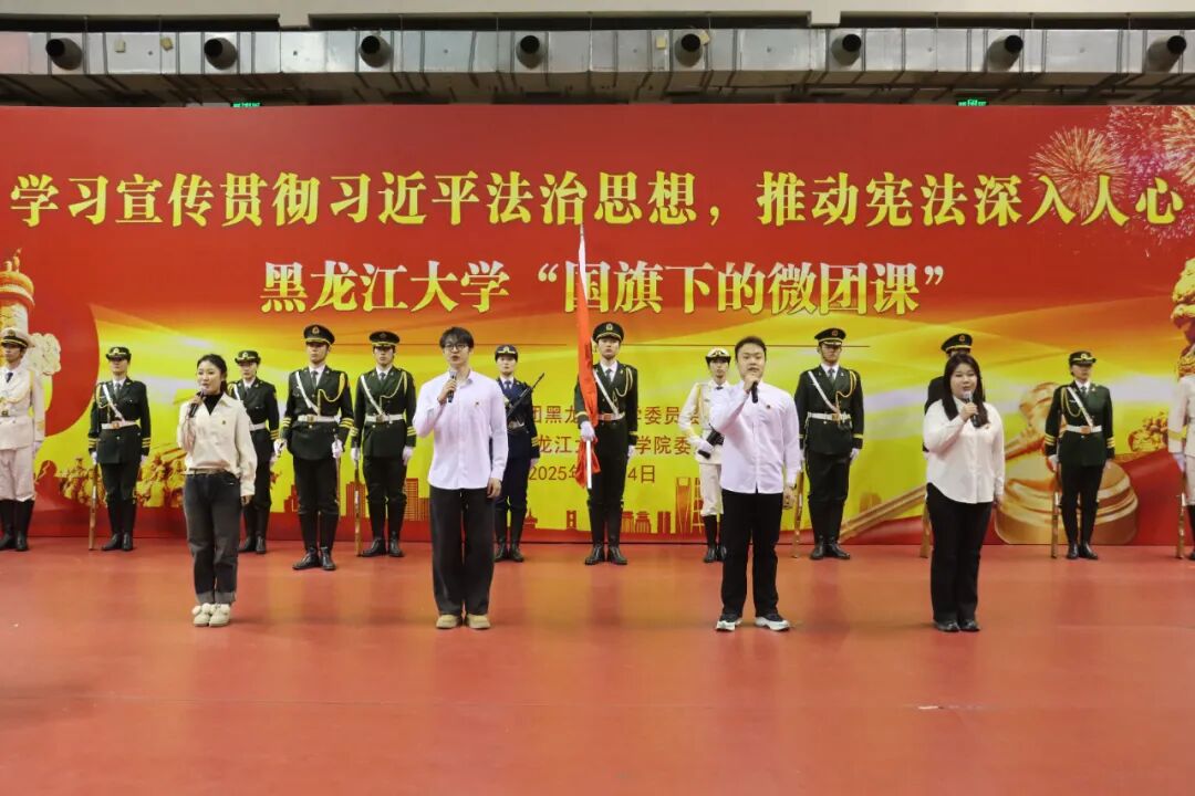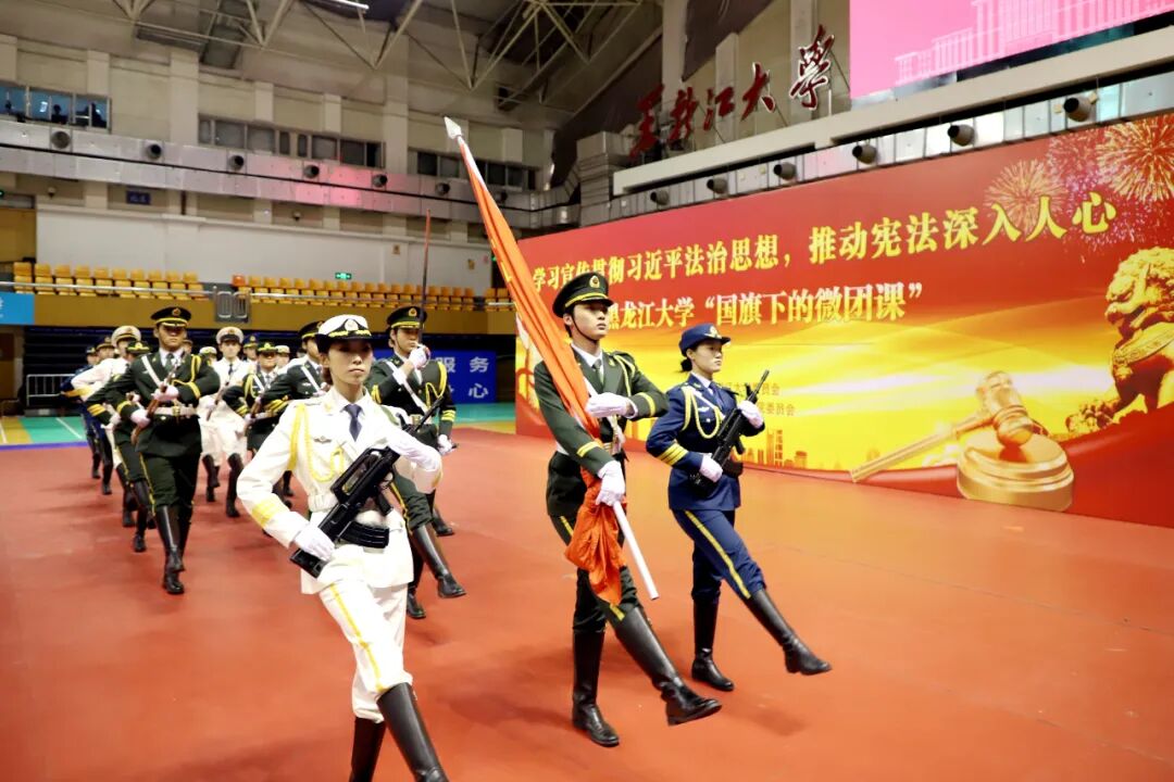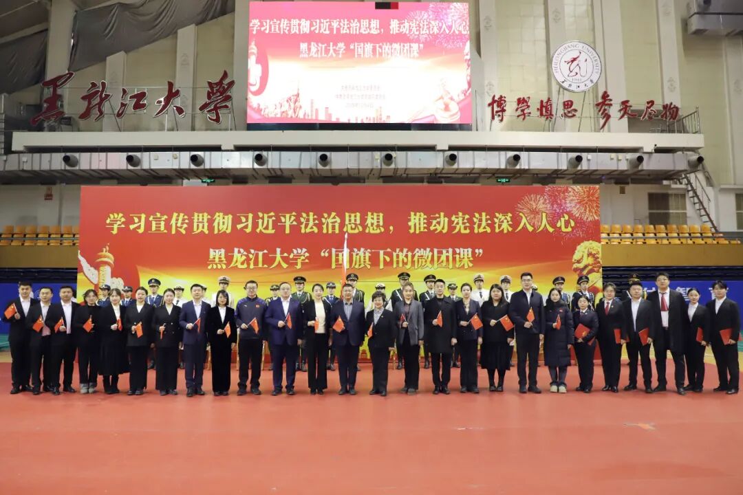 12月4日早,黑龙江大学在体育馆举行“学习宣传贯彻习近平法治思想,推动宪法深入人心”国旗下的微团课。校党委常委、宣传部部长杨其滨,学生工作部、校团委、法学院、体育教学研究部负责同志及师生代表参加活动。法学院党委书记孙世萍主持活动。