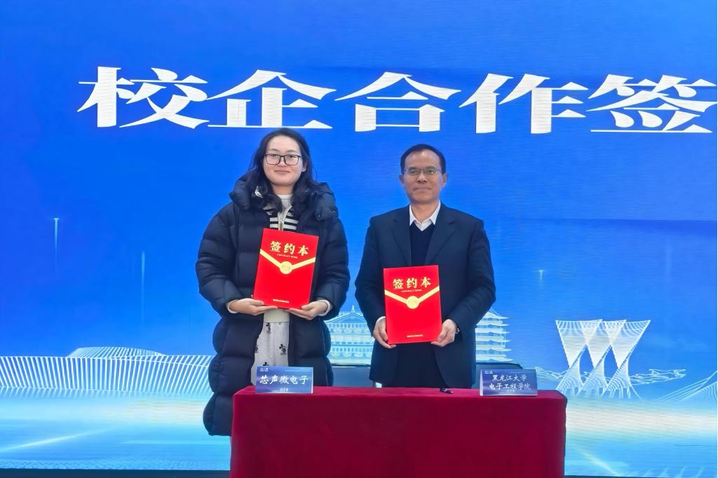 电子工程学院党委书记王圣宏与江苏芯声微电子科技有限公司人事经理黄雯妍签约。