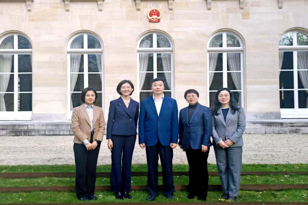 代表团拜访中国驻法国大使馆,与教育处负责人周家贵公参进行会谈。王敬波校长详细介绍了黑龙江大学的学科优势与对法合作重点,尤其是与巴黎南戴尔大学共建中法学院的合作成果,希望使馆支持学校继续扩大对法合作领域、提高合作层次。周家贵公参重点介绍了作为马克龙总统访华重要配套活动的第二届中法教育发展论坛情况,表示两国政府以高层共识为引领,高位推进中法高等教育合作,王敬波校长率团访问法国恰逢其时,希望学校抓住合作窗口期,与法国高校重点开展中外合作办学机构与项目等合作,积极通过“3年1万”倡议和政府奖学金资源,吸引更多优秀法国青年学子攻读黑龙江大学优质学位项目,表示将为黑大与法国高校的合作提供政策指导与必要协调支持。