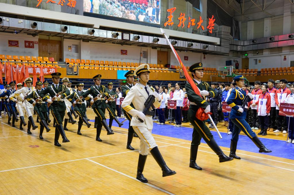 开幕式上还进行了文艺表演。交响乐《钢铁洪流进行曲》澎湃旋律如万马奔腾,奏响青春报国最强音;拉拉操《律动少年》以整齐划一动作、明快昂扬节奏,将青春活力与团队协作展现得淋漓尽致;武术表演《龙腾虎跃》气势如虹,彰显出新时代青年朝气蓬勃,锐意进取的精神风貌;大合唱《我爱你中国》激昂高扬,嘹亮歌声振奋人心,激荡浓烈爱国热情;民乐乐团奏响《精忠报国》乐韵苍劲豪迈,铮铮乐声尽显家国情怀与民族气节。