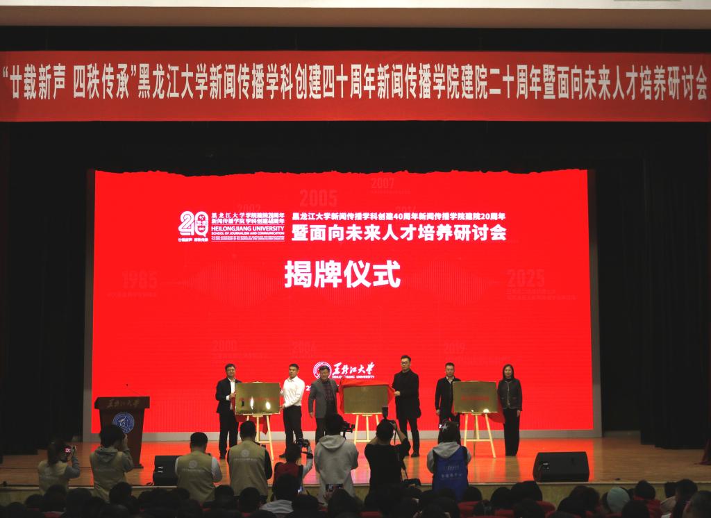 在人才培养平台揭牌环节,黑龙江报刊传媒集团、黑龙江新媒体集团及饶河县电商办负责人,分别与新闻传播学院名誉院长徐江善、党委书记江瑞、院长朱志勇共同为“产教融合研究生工作站”“教学实践基地”“数字商业创意传播产业学院”揭牌。