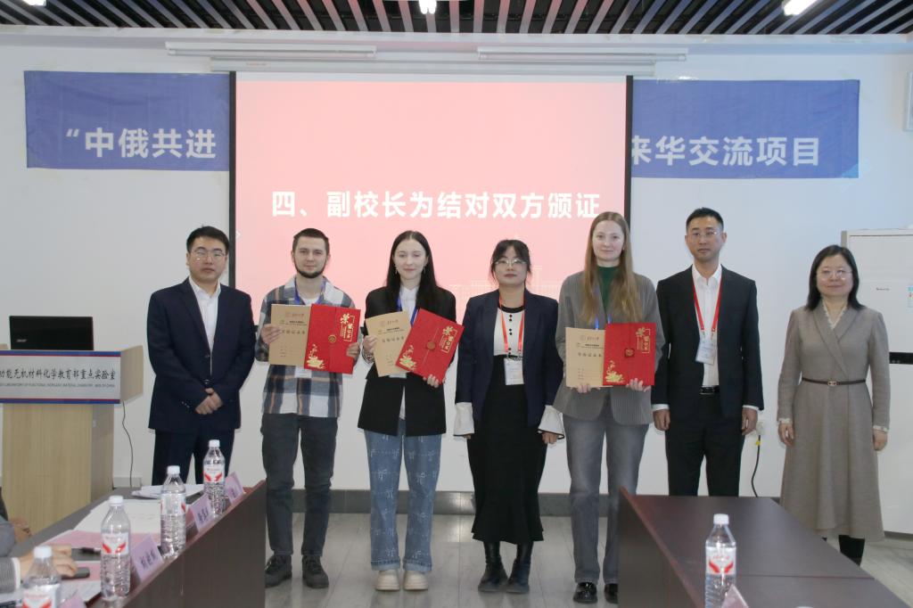 按照项目安排,达丽娅·伊万诺夫娜·沙姆申娜将与李洸伕副教授在材料合成方向结对,卡米勒·迪纳罗维奇·艾哈迈德加列耶夫、瓦列里娅·阿纳托利耶夫娜·亚赫娅将分别与段春波副教授、高飞飞博士在器件表征方向结对。启动仪式上,魏影副校长为结对学者颁发了“国际青年人才交流大使”证书。