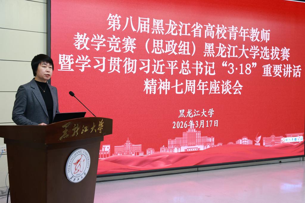 为深入贯彻落实习近平新时代中国特色社会主义思想,强化思政课教学改革创新,坚持以赛促练、以赛促建、以赛促改,值此习近平总书记“3·18”重要讲话发表七周年之际,3月17日,第八届省高校青年教师教学竞赛(思政组)黑龙江大学选拔赛在学校主楼A座226会议室举办。学校党委副书记刘凤影及相关部门负责人出席,本次大赛邀请黑龙江省思政课教指委专家担任专家评审。大赛由马克思主义学院党委书记张丹主持。
