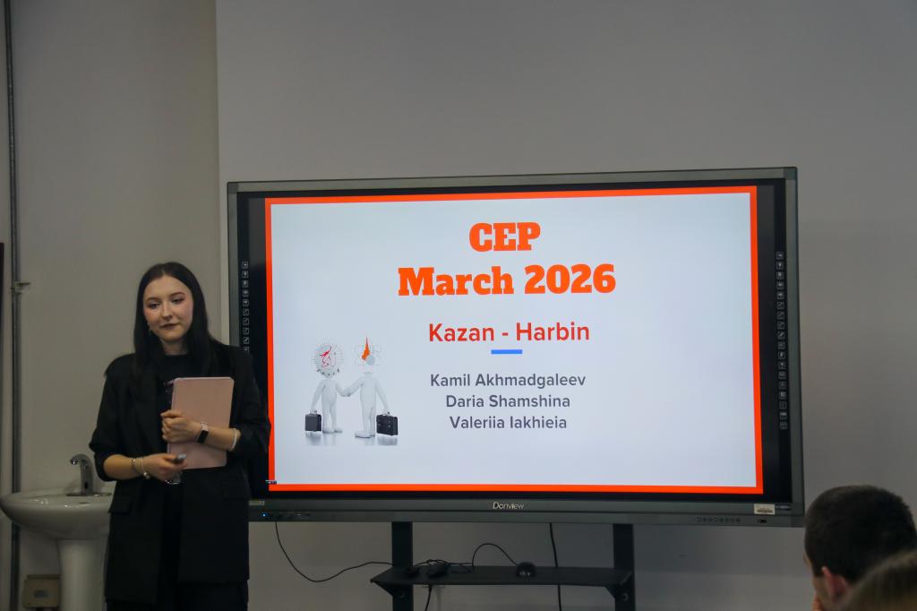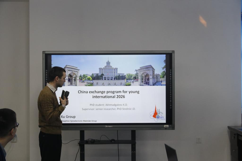 在闭幕式上,三位俄罗斯青年学者通过精心准备的PPT,向与会师生分享了他们在哈尔滨的科研与生活点滴。卡米勒在汇报中重点展示了他与中方团队在铜配合物光物理性质研究方面的合作成果,通过先进表征手段,系统研究了系列化合物的温度依赖发光行为,为理解材料的激发态动力学提供了重要数据支持。他在发言中感慨:“从喀山到哈尔滨,这段跨越万里的学术之旅让我收获满满。中国同行的严谨与热情,让我对未来的科研合作充满期待。”瓦列里娅和达丽娅则用一张张生动的照片,回顾了他们在哈尔滨留下的美好记忆。达丽娅在发言中动情地说:“科学是无国界的,能在这样友好的氛围中做学术研究,是我们此次访学最宝贵的记忆。”瓦列里娅也分享道:“黑大老师们的悉心安排,让我们在异国他乡感受到了家的温暖。这份心意,比任何学术指导都更珍贵。”她们还特别用中文向在场师生表达了感谢:“非常感谢!谢谢你们的关心!”